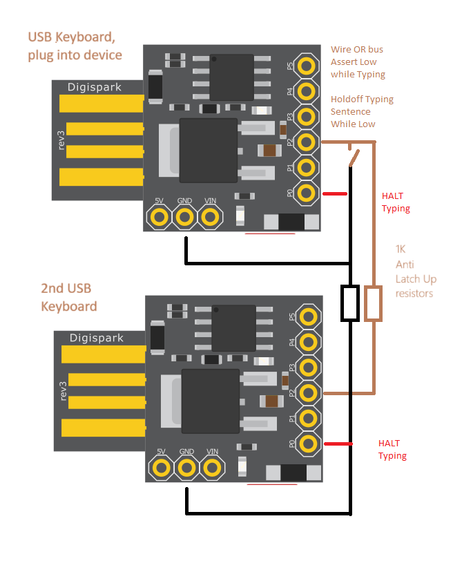 You can optionally use two or more DigiSparks connected together so they take turns typing.