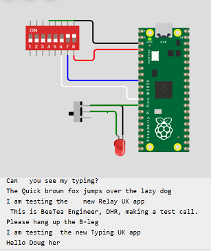 ts: 00009761 ms GA This is BeeTea Engineer, DHR, making a test call.GA Please hang up the B-leg GA I am testing the new text relay app GA Hello Doug here GA Can you see my typing? GA The Quick brown fox jumps over the lazy dog GA I am testing the new telay relay app GA ts: 00113746 ms GA